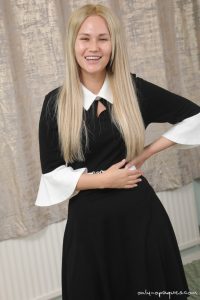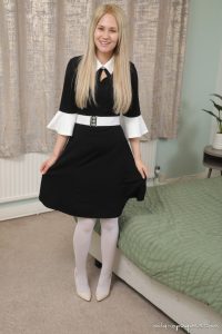 It’s been awhile since I shared anything of the lovely Daisy Rose so I thought I would post this free gallery from one of her recent updates at Only Opaques. She is looking rather cute in a this black and white minidress with a pair of high heels and white opaque pantyhose on her lovely legs. Daisy flashes that killer smile at the camera and she lies on the bed, pulling her dress up her thigh and exposing more of those sexy legs in her tights. Her next move is to remove her heels and allow us to check out her cute nylon-clad feet.