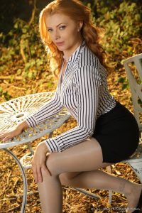 Beautiful redhead Scarlett Foxett is posing outside with the sun coming through the trees in this free gallery from Only Secretaries. Perhaps she is relaxing on her lunch break? Her secretary outfit includes a striped bra with a short black miniskirt and matching black high heels. Those incredible legs of hers are encased in shiny grey pantyhose. Scarlett puts a foot up on the table giving us an upskirt peek of her white lace panties that she is wearing under her nylons. The blouse comes off to show off the matching bra before she slides the skirt off her hips. She allows us to check out those beautiful breasts when she removes her blouse to finish her photo shoot topless. Would you like to see more hot babes posing in secretary uniforms and pantyhose? Click HERE for instant access to OnlyAllSites today!