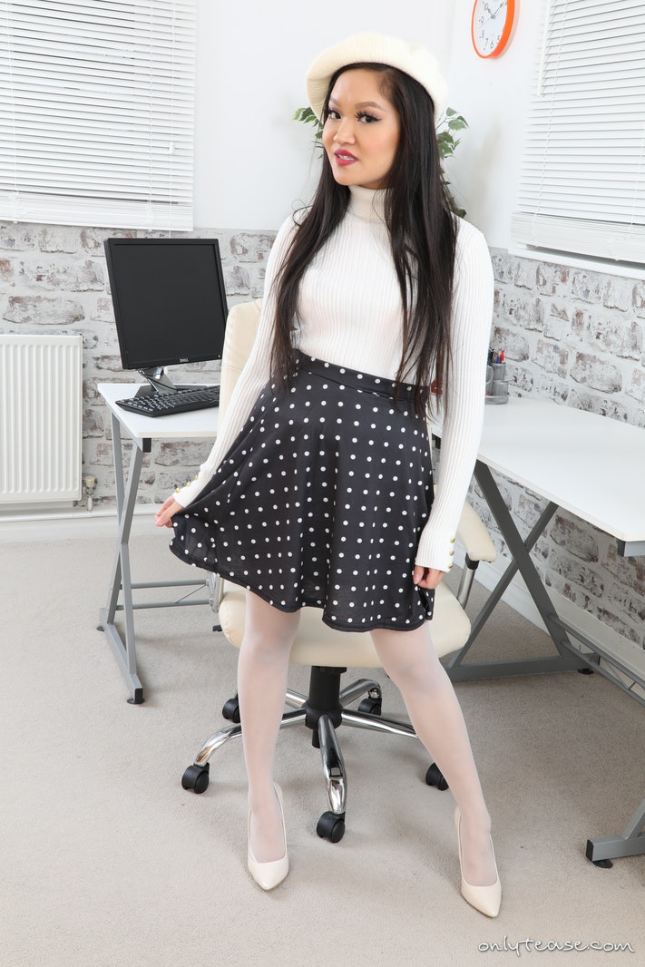 I haven’t shared a whole lot of the lovely Ophelia Spice in the past but over the last few months I have been becoming a bigger fan of this petite model from OnlyTease and their sister sites. She has a very slim frame and adorable small breasts that you will see when she finishes her striptease here. Ophelia is posing in a cute polka dot dress with high heels and sheer white stockings. This naughty secretary sits in her chair and pulls up her skirt to flash her pink panties at the camera. This cute glamour model strips for the camera, eventually posing in nothing but her high heels, nylons, suspenders and panties. She even pulls those down to give us a much better view of her ass. Enjoy the free gallery and if you’d like to see more of Ophelia and other beautiful babes in sexy outfits and nylons, click the banner below for instant access to OnlyAllSites today!